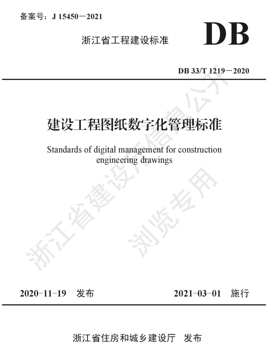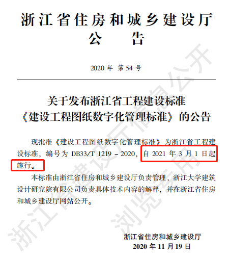 On February 1, the Department of housing and urban rural development of Zhejiang Province issued the notice on Issuing engineering construction standards of Zhejiang Province< Digital management standard of construction engineering drawings > Announcement of standards from From March 1, 2021 execute.